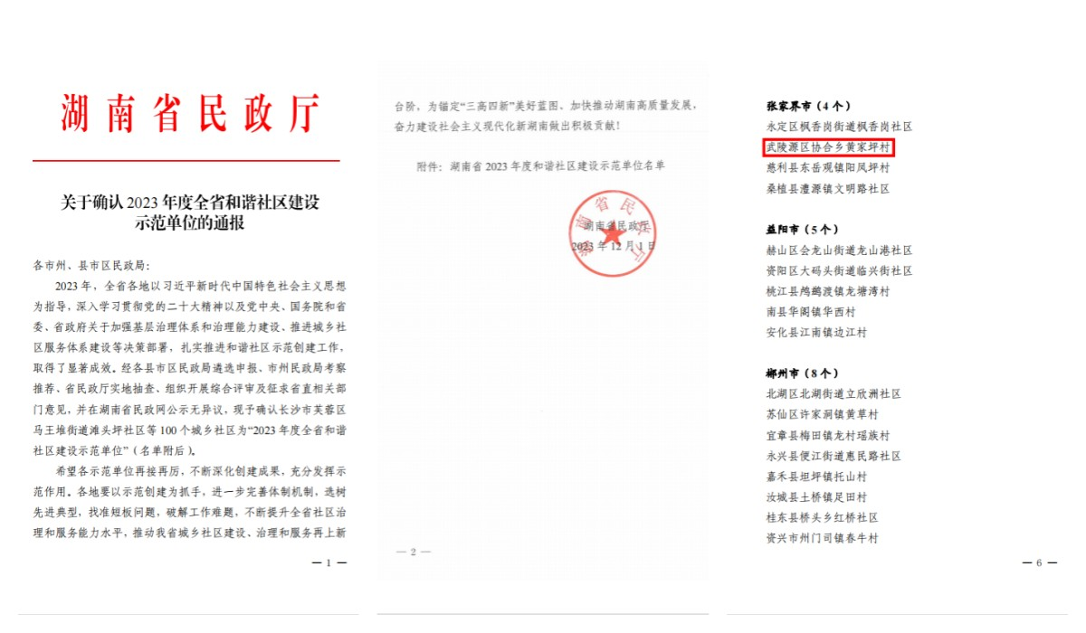 近日,湖南省民政厅印发《关于确认2023年度全省和谐社区建设示范单位的通报》,旅游集团乡村振兴驻点村张家界市武陵源区协合乡黄家坪村荣获“2023年度全省和谐社区建设示范单位”荣誉称号。